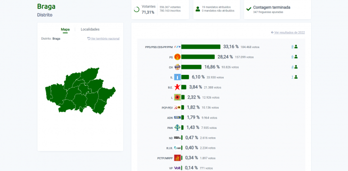 AD vence em Braga com 33,16%, com 184.468 votos e elege 8 deputados, segundo os dados da Secretaria Geral do Ministério da Administração Interna, no seu site.