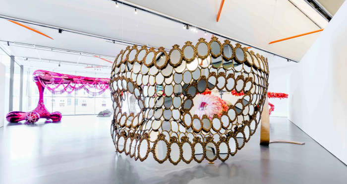 Servindo-se de 255 molduras barrocas em bronze (desenhadas e decoradas pela artista) e de 510 espelhos sobrepostos como se de escamas se tratasse, constrói uma surpreendente máscara veneziana.