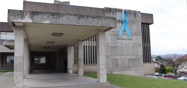 A fachada do edifício da Câmara Municipal de Amares está adornada com um grande laço azul, como forma de assinalar Abril – Mês da...