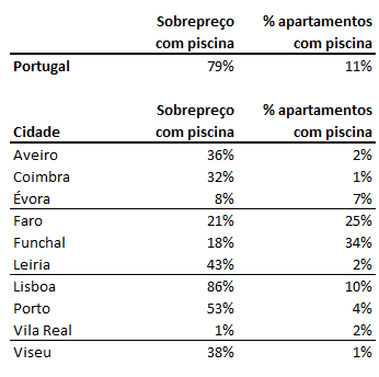 Lisboa é a cidade onde a diferença de preço entre comprar um apartamento com ou sem piscina é maior, custando mais 86% os que dispõem de piscina. Seguem-se as diferenças de preço do Porto (53% mais caras), Leiria (43% mais caras), Viseu (38% mais caras), Aveiro (36% mais caras), Coimbra (32% mais caras). Por menos de 30% de diferença de preço, encontra-se Faro (21% mais caras), Funchal (18% mais caras), Évora (8% mais caras) e Vila Real (1% mais caras).