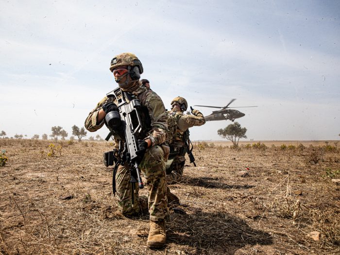 Militares da Unidade de Protecção da Força (UPF) preparados pelo Núcleo de Operações Tácticas de Projecção (NOTP) da Força Aérea Portuguesa (FAP), em primeiro plano armado com uma Heckler & Koch G36 (Gewehr 36), em calibre 5.56×45mm NATO, com carregador de tambor, Beta C-Mag, de 100 munições, após descida em “rappel” a partir de um helicóptero Sikorsky UH-60M Blackhawk (7445) da Força Aérea da Eslováquia, no decurso do exercício europeu “Hot Blade”, em Beja, a 19 de Junho de 2023.