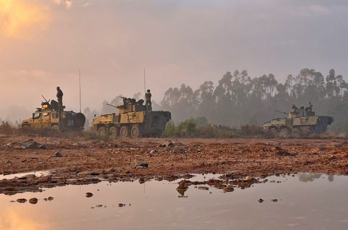 Podemos observar viaturas blindadas de rodas Pandur II 8×8 – nas variantes de ICV (“Infantry Carrier Vehicle”), armada com metralhadora pesada M2 calibre 12,7x99mm NATO ao topo do “chassis” e com as respectivas fitas de remuniciamento ao ombro de um dos militares; e IFV (“Infantry Fighting Vehicle) com torre e peça de 30mm – bem como de viatura táctica ligeira blindada 4×4 URO VAMTAC ST5, armada com metralhadora pesada M2 calibre 12,7x9mm NATO.