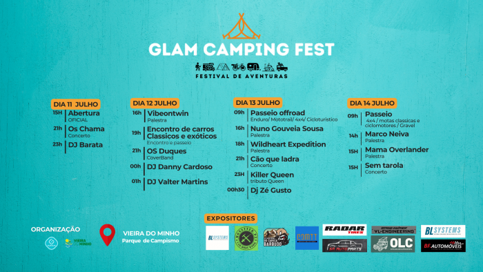 O Glam Camping Fest, organizado pela empresa GlamTours, “é um festival único que combina a aventura, natureza e a cultura das viagens, do campismo, overland e caravanismo.” Segundo a organização ” Este evento proporciona uma oportunidade para entusiastas de atividades ao ar livre se reunirem, partilharem experiências e desfrutarem de uma variedade de atividades relacionadas com o campismo, aventura, música e cultura local. O festival destina-se a promover um estilo de vida ativo e aventureiro, com um forte enfoque na sustentabilidade e na apreciação da natureza. Os participantes são encorajados a interagir com o ambiente natural de forma respeitosa, participando em atividades que destacam a beleza e a diversidade da região de Vieira do Minho.”
