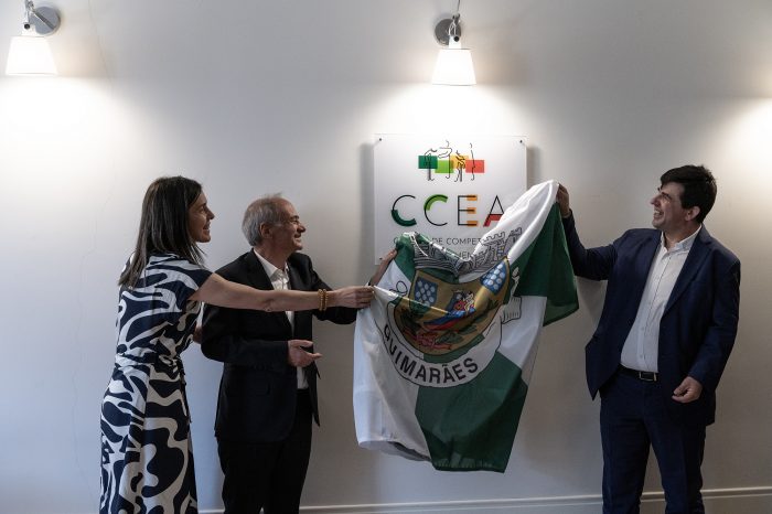 Decorreu na tarde desta quarta-feira, dia 8 de maio, no salão nobre da Câmara Municipal de Guimarães, a assinatura do protocolo de colaboração entre o Município de Guimarães e o CCEA – Centro de Competências de Envelhecimento Ativo, que tem como objetivo a promoção de uma abordagem positiva ao envelhecimento, capacitando profissionais para que estes possam oferecer cuidados e serviços diferenciadores e de alta competência, que permitam melhorar a qualidade de vida dos idosos. De seguida, foram inauguradas as instalações do CCEA na Rua da Rainha D. Maria II (Loja Oficina). Domingos Bragança, Presidente da Câmara Municipal de Guimarães, Paula Oliveira, vereadora da Coesão Social, Nuno Marques, Diretor Executivo do Centro de Competências de Envelhecimento Ativo, e representantes das mais variadas instituições do concelho marcaram presença nas sessões.