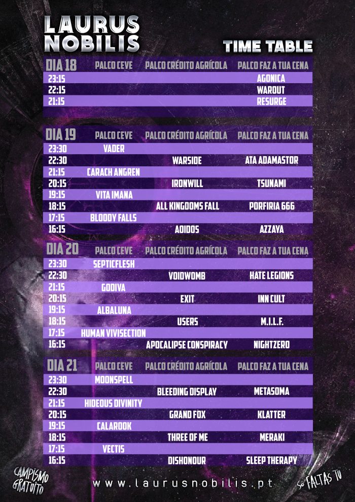 Os Septicflesh regressam ao Laurus, 6 anos depois, para a apresentação do novo álbum “Modern Primitive”. Já os polacos Vader vêm apresentar o espetáculo de celebração dos 40 anos de carreira, exclusivo em Portugal no Laurus Nobilis. Os Moonspell regressam a Famalicão com um alinhamento old school que se foca nos seus dois primeiros clássicos: Wolfheart e Irreligious, mas que deixa em aberto uma viagem até aos seus early days.