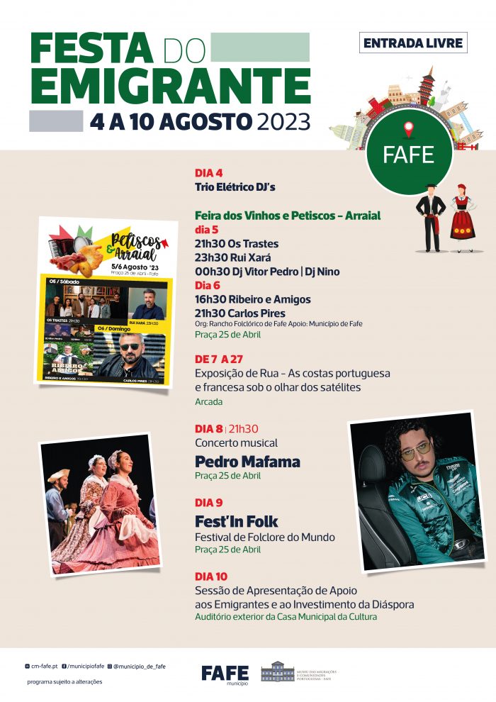 A Festa do Emigrante celebra-se em Fafe de 4 a 10 de agosto e arranca com o Trio Elétrico e DJ’s para assinalar a chegada dos milhares de emigrantes que todos os anos regressam a Fafe. Este momento antecipa a estreia da «Feira dos Vinhos e Petiscos», um arraial minhoto organizado pelo Rancho Folclórico de Fafe e que se realizará nos dias 5 e 6 de agosto na Praça 25 de Abril.