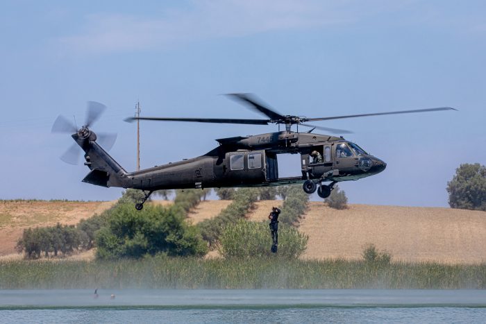 Exercício de “helocast” por parte de militares do Destacamento de Acções Especiais (DAE), a Unidade de Operações Especiais da Marinha Portuguesa, a partir de um helicóptero Sikorsky UH-60M Blackhawk (7445) da Força Aérea da Eslováquia, na Barragem do Pisão, geo-referecianção 38.064978037171436, -7.987378273928309 , ref. https://goo.gl/maps/Ce6zHW1UttkRAWmz8 , Beja, a cerca de 5 km a Oeste da Base Área n.º 11, a 16 de Junho de 2023. Este “helocast” decorre no no âmbito do exercício europeu “Hot Blade”.